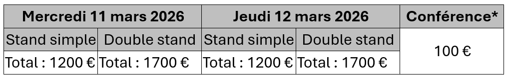 Le stand double correspond à une table de deux tables de 2 personnes (environ 1m50 / 80 cm x2) et de l’espace derrière pour placer quelques roll up ou autres.
